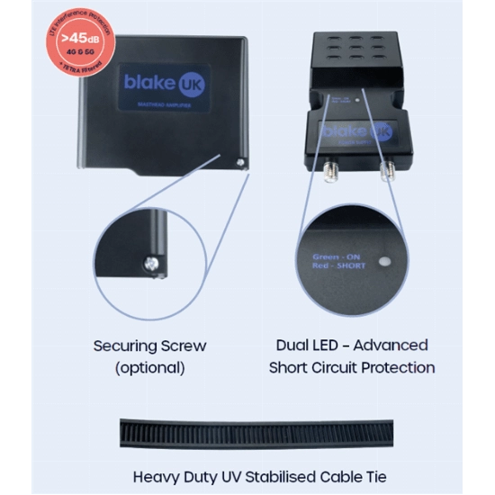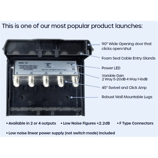 Elevate your reception quality with the RED Class 1, Blake 2-Way Variable Gain 5-20dB Masthead Amplifier. This CE/UKCA compliant amplifier kit offers exceptional performance, incorporating advanced 5G/4G LTE filtering and amplification for TV frequencies within the 21-48 band (470-694MHz). With its variable 5-20dB gain and low noise figures (<2.5dB typical), it ensures optimal signal strength and clarity. The amplifier features F-type connectors on both inputs and outputs for easy connectivity.