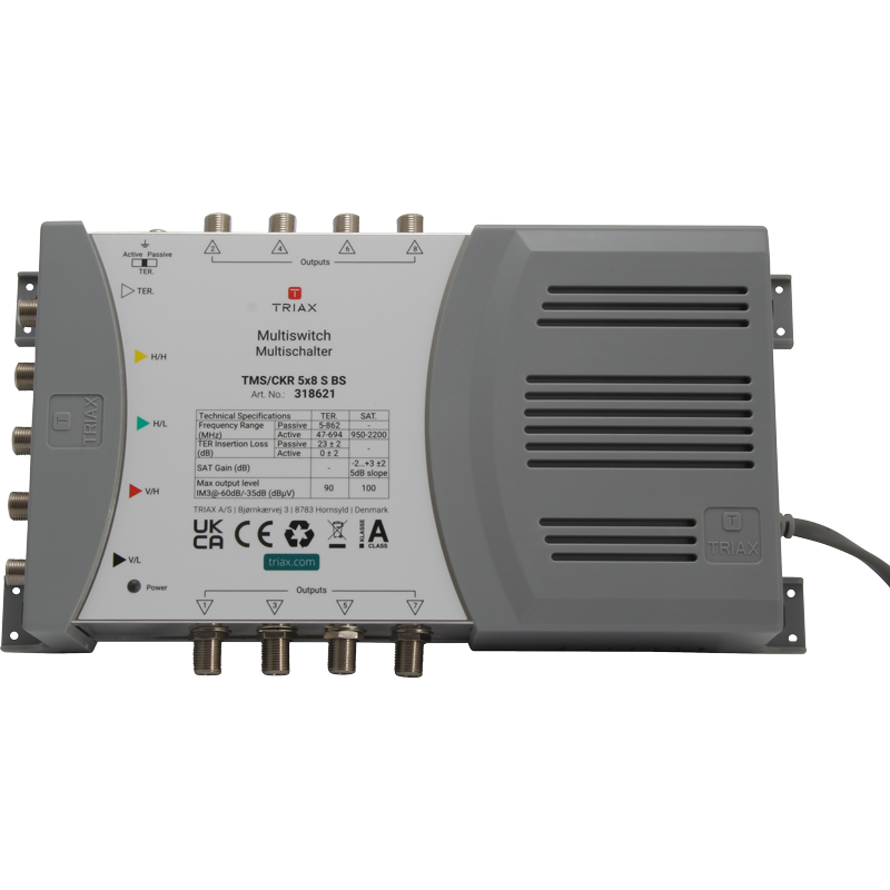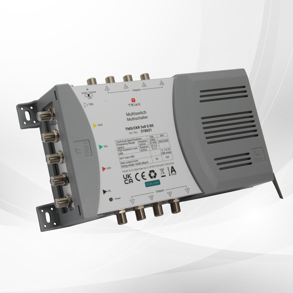 Standalone multiswitch for 1 Satellite position with 5 inputs and 8 outputs, suitable for distributing satellite and terrestrial signals in small and medium sized systems. Dependability guaranteed: a 6-year warranty is our guarantee that TRIAX’s core values of reliability and innovation are the foundation of our new multiswitches. The TMS/CKR 5×8 S BS offers excellent performance and flexibility, with a compact design for installations even in confined spaces.