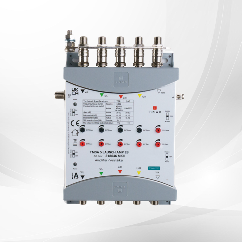 The TMSA 5 Launch Amp EB, with 5 inputs and 30dB gain, compensates for the cable loss in your designed multiswitch systems. Equipped with earth bars and powered directly via the DC input port, or line powered via all Sat lines.